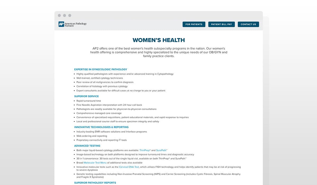 AP2 came to us after seeing the medical website development that we completed for another client. They were impressed with not only the design of the site, but also with the functionality and ease of use. We were excited to work with them, as we felt that we could make a big impact for them, their patients, and their pathologists by simplifying the user experience, on both the front and the backend of the site, by leaps and bounds.Who Are They Exactly