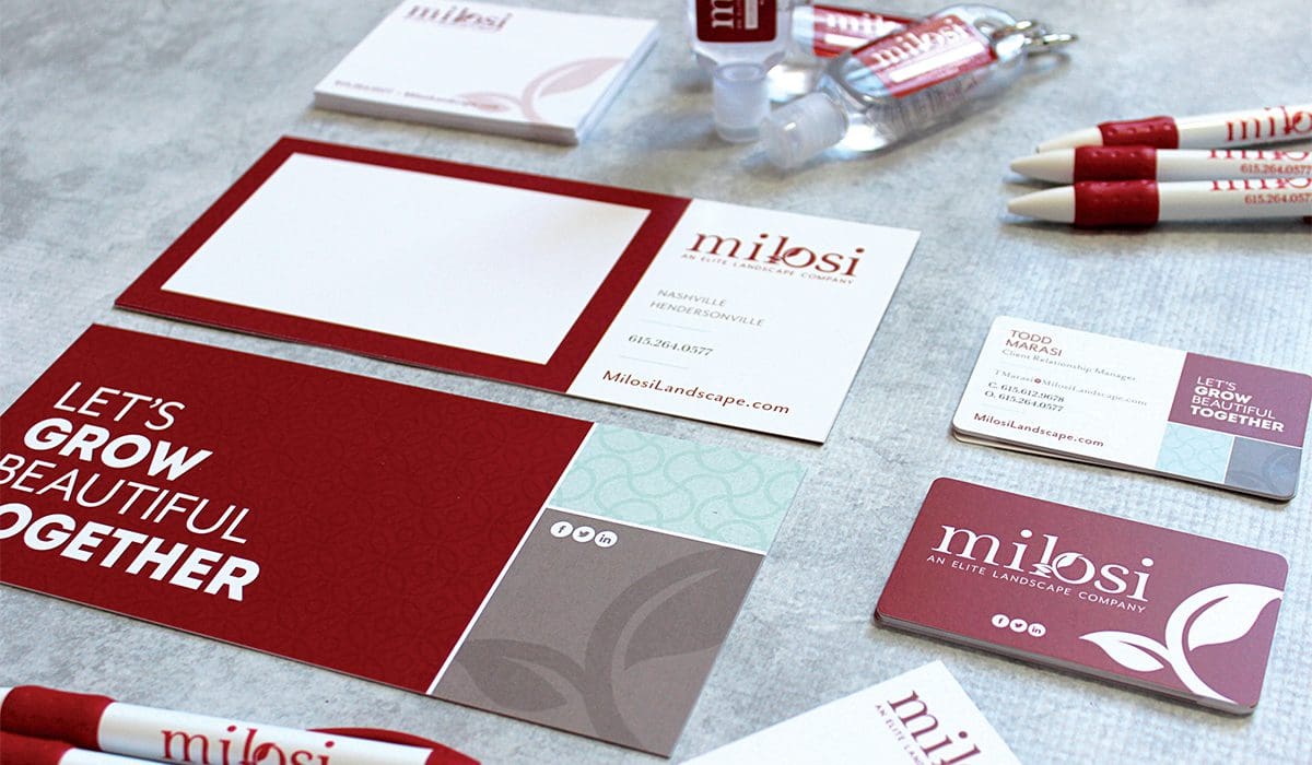 Typically, the next step in a brand refresh is to address the paper goods. We started with the stationary and created a fresh, new business card that showcases the brand well and stands out from the masses of cards that are fighting to stay out of the trash can. The Milosi card highlights the soul of the brand with the tagline, “Let’s Grow Beautiful Together,” and seeks to invite the recipient to work alongside the Milosi team to beautify their property. It’s printed on silk, which gives it a luxurious feel and a fighting chance to make an impact.