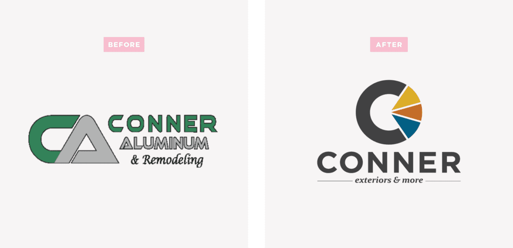 Take Exhibit A, for example. The Conner logo before shows a mark that doesn’t convey any meaning and fails to indicate a solid, custom feel. It doesn’t tell you that this is a family-owned, local business that has been around for more than 40 years. And it doesn’t convey the fact that the company is professional, multi-talented (beyond aluminum and remodeling), and bold.