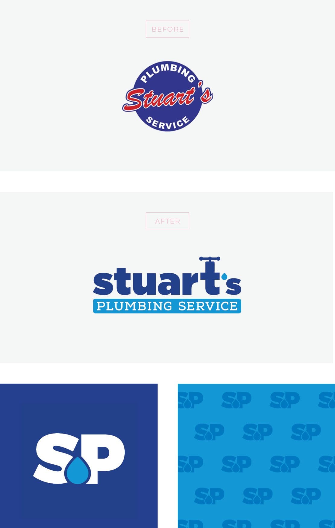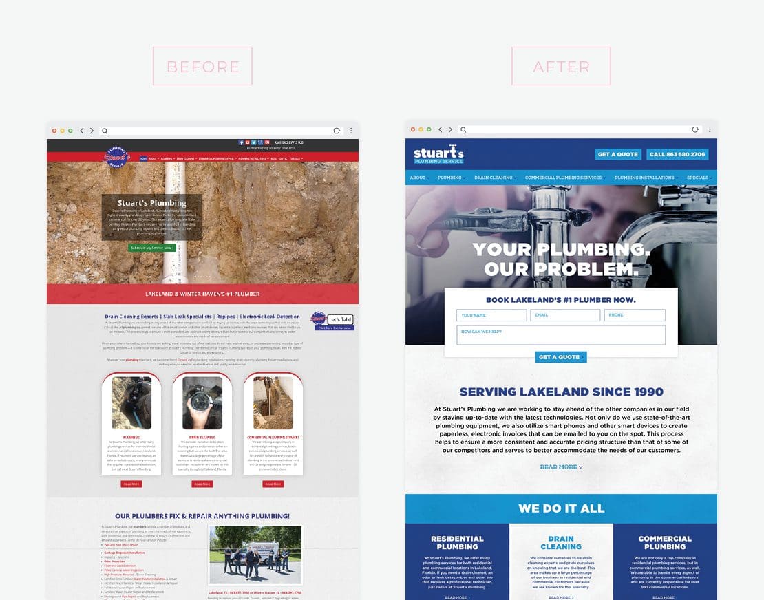 As we worked on the wireframes, we first set out to rearrange the main navigation. Our design team wanted to simplify the site’s navigation header. Users needed to be able to quickly find the pages they wanted. The navigation is a really important part of this site since there is so much content on it to show off and keep organized. As we created our wireframe, we structured the navigation to guide the viewer through the whole menu easily. During the design stage, we brought the menu to life with the page design. We took this time to emphasize compelling calls-to-action, helpful copy and enticing photos. Next, we designed how we wanted the content to look. This is when we got to let the new Stuart’s Plumbing brand shine, as we applied brand colors and fonts throughout the pages. We placed the new Stuart’s logo at the forefront, filled the pages with on-brand imagery and copy that emphasized who they are and what they do. For the updated background, we incorporated a speckled texture that we pulled from the brand stationery we designed. The “SP” icon pattern was also incorporated. Regarding the interior page, we selected the Drain Cleaning page. This is a major service line for Stuart’s Plumbing, and the structure of the page could be easily duplicated for additional service lines. Here, we changed outdated backgrounds and off-brand colors for more professional-looking graphics that reflected the new brand. We took out repetitive copy and updated with content that was concise and took on a more professional voice and tone. You can see a comparison of the old homepage vs the new homepage we developed for Stuart's Plumbing below.